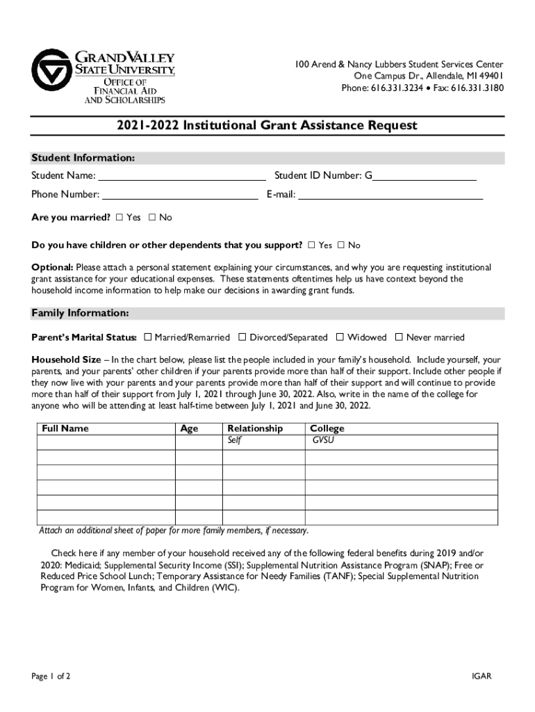 100 Arena & Nancy Lubbers Student Services Center One Campus Dr., Allendale, MI 49401 Phone: 616.331.3234 Fax: 616.331.318020212022 Institutional Grant Assistance Request Student Information: Student