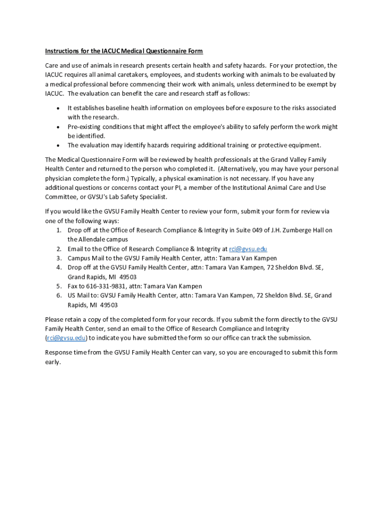 Get the free Instructions for the IACUC Medical Questionnaire Form