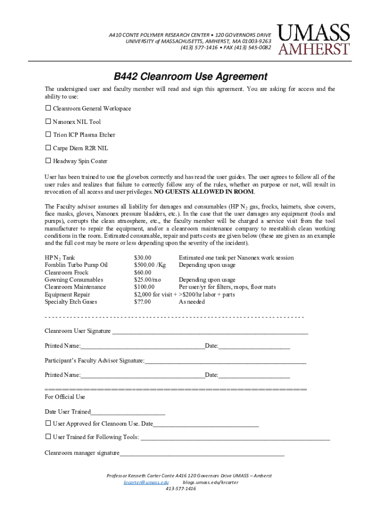 Any individual or organization who intends to use the cleanroom facility is required to file the blogsumassedukrcarterfilesb442 cleanroom use agreement.