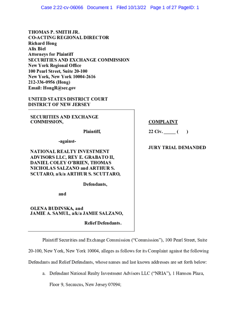 Case 2:22cv06066 Document 1 Filed 10/13/22-Page 1 of 27 Paged: 1THOMAS P. SMITH JR. COACHING REGIONAL DIRECTOR Richard Hong Alex Biel Attorneys for Plaintiff SECURITIES AND EXCHANGE COMMISSION New