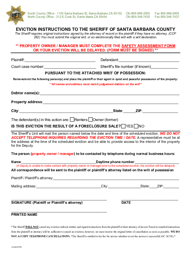 SANTA BARBARA COUNTY SHERIFFS OFFICE CIVIL UNIT South County Office 1105 Santa Barbara St, Santa Barbara CA 93102 Of:8055682900 Fax 8055682909 North County Office 312 E Cook St, Building D, Santa