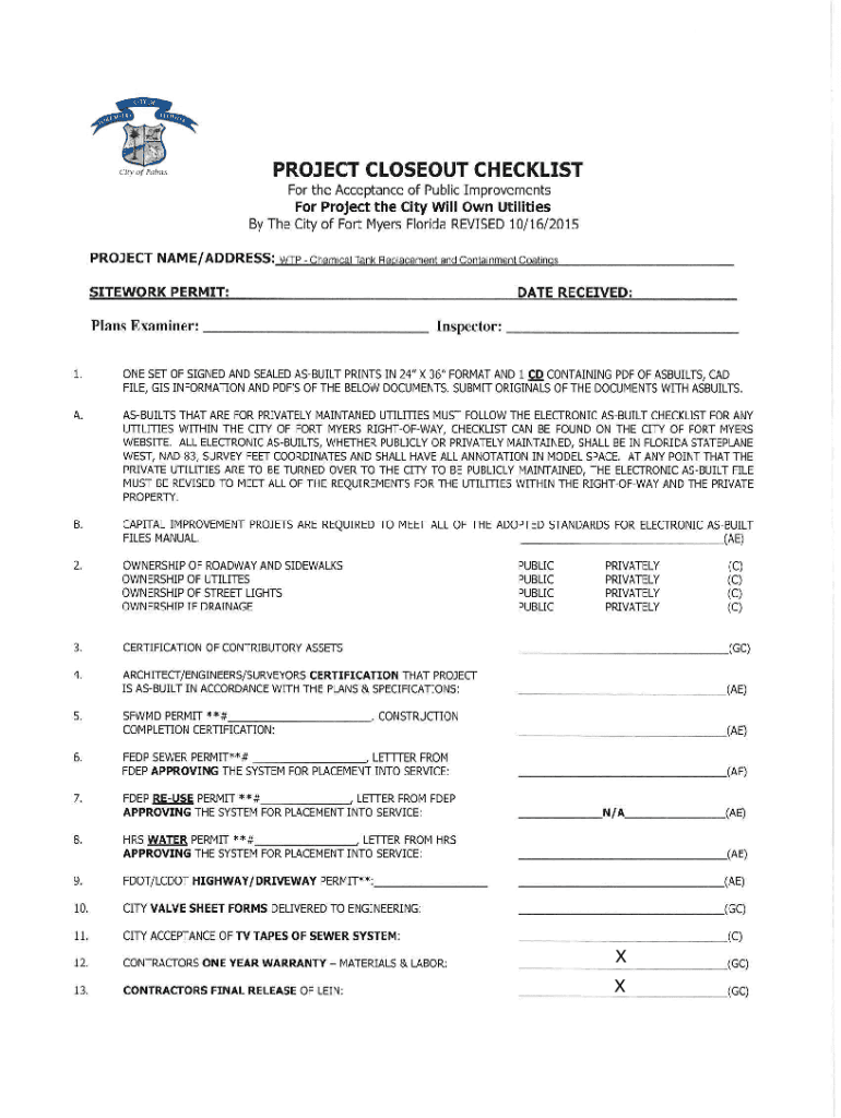 City of PalmsPROJECT CLOSEOUT CHECKLIST For the Acceptance of Public Improvements For Project the City Will Own Utilities By The City of Fort Myers Florida REVISED 10/ 16/ 2015PROJECT NAME/ ADDRESS: