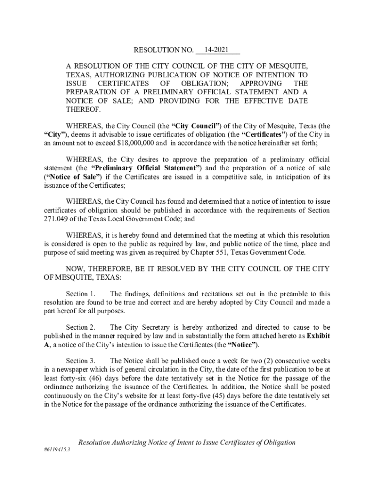 142021 RESOLUTION NO. ___ A RESOLUTION OF THE CITY COUNCIL OF THE CITY OF MESQUITE, TEXAS, AUTHORIZING PUBLICATION OF NOTICE OF INTENTION TO ISSUE CERTIFICATES OF OBLIGATION; APPROVING THE PREPARATION