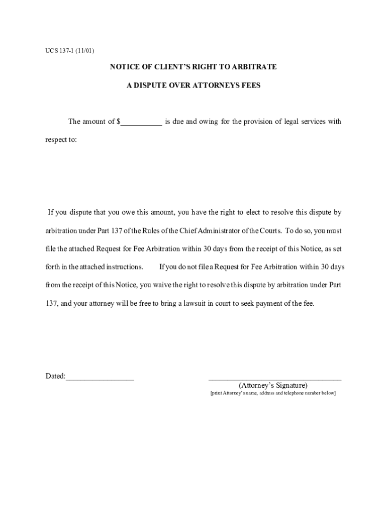 UCS 1371 (11/01)NOTICE OF CLIENTS RIGHT TO ARBITRATE A DISPUTE OVER ATTORNEYS Seethe amount of $___ is due and owing for the provision of legal services with respect to:If you dispute that you owe