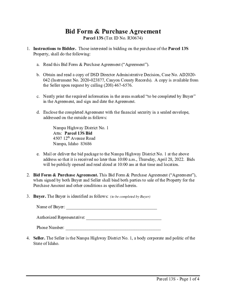 Bid Form & Purchase Agreement Parcel 13S (Tax ID No. R30674) 1. Instructions to Bidder. Those interested in bidding on the purchase of the Parcel 13S Property, shall do the following: a. Read this