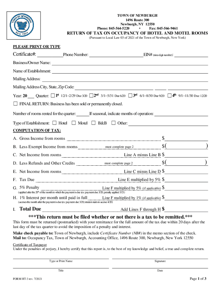 TOWN OF NEWBURGH 1496 Route 300 Newburgh, NY 12550 Phone: 8455645220 Fax: 8455669461RETURN OF TAX ON OCCUPANCY OF HOTEL AND MOTEL ROOMS (Pursuant to Local Law 03 of 2021 of the Town of Newburgh, New