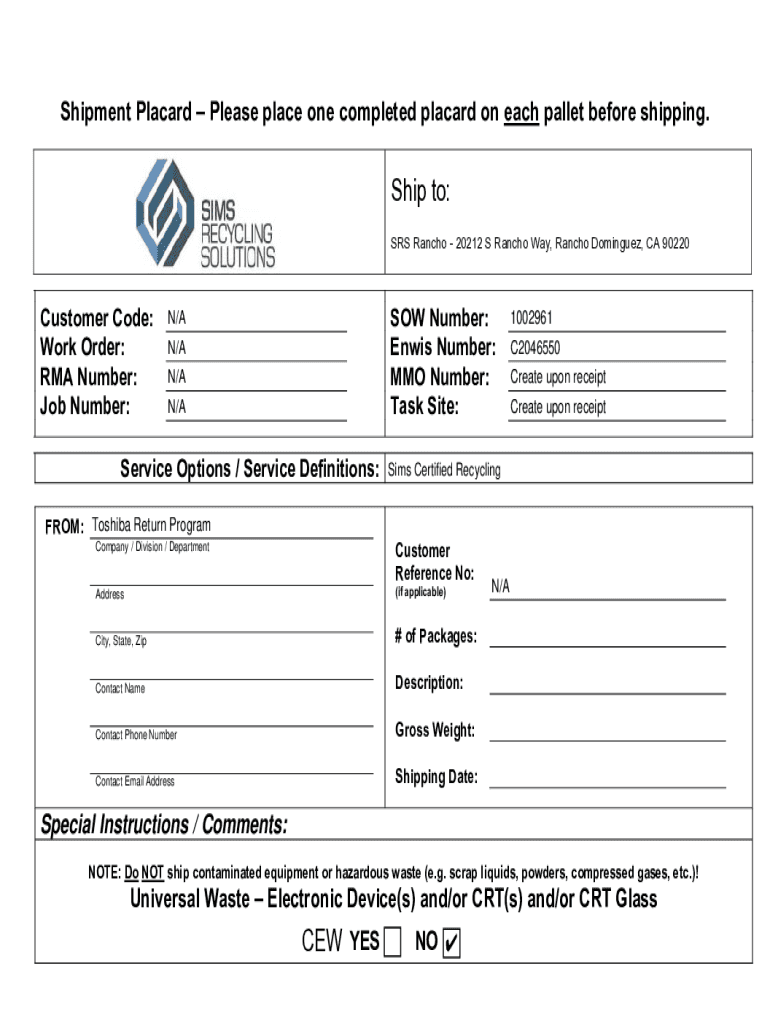 Shipment Placard Please place one completed placard on each pallet before shipping. Ship to: SRS Rancho 20212 S Rancho Way, Rancho Dominguez, CA 90220Customer Code: Work Order: RMA Number: Job Number:SOW