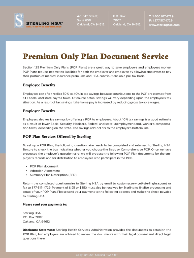 The Premium Only Plan (POP) Document Application is essential for California employers looking to implement a POP Plan, which allows employees to pay medical insurance premiums and HSA contributions on a pre-tax basis. By utilizing this application, employers can significantly reduce their taxable income while enhancing employee benefits. This process not only simplifies the payment of medical premiums but also aids in compliance with tax regulations.