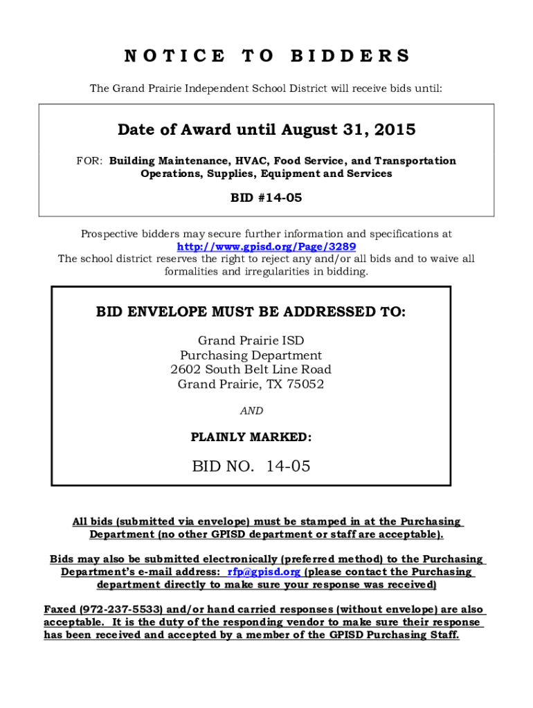 NOTICE TO BIDDERS The Grand Prairie Independent School District will receive bids until:Date of Award until August 31, 2015, FOR: Building Maintenance, HVAC, Food Service, and Transportation Operations,