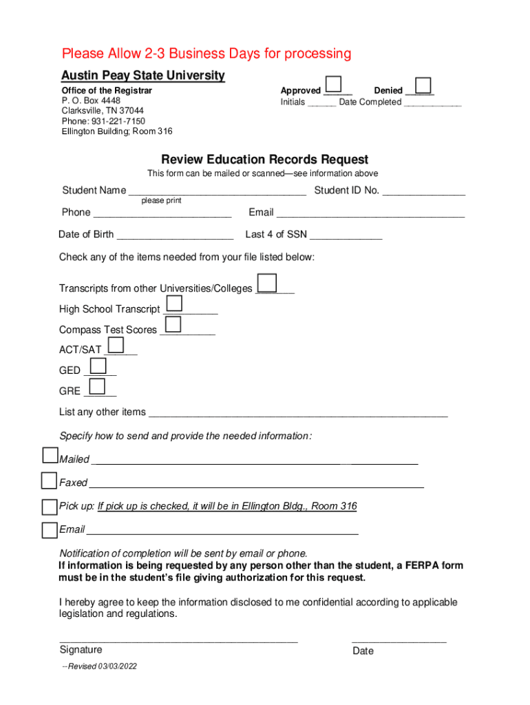 Please Allow 23 Business Days for processing Austin Play State University Office of the Registrar P. O. Box 4448 Clarksville, TN 37044 Phone: 9312217150 Ellington Building; Room 316Approved ___ Denied