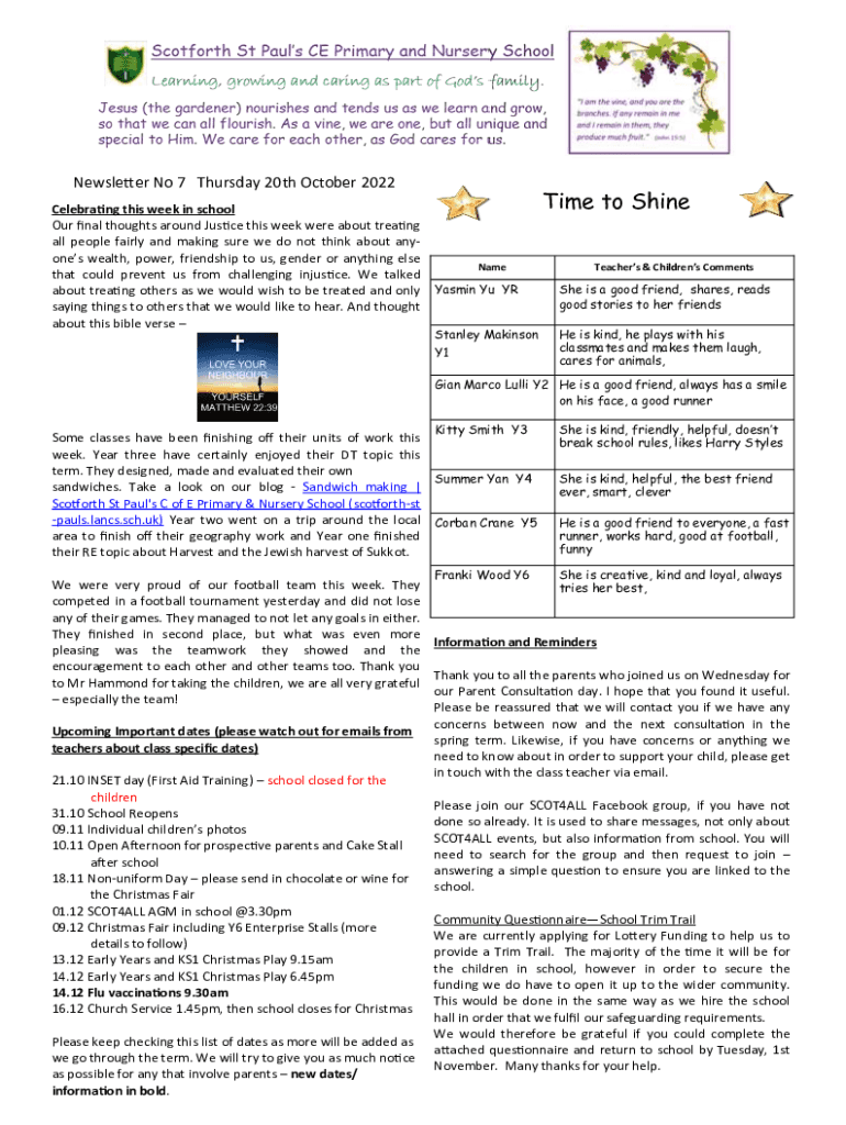 Newsletter No 7 Thursday 20th October 2022 Celebrating this week in school Our final thoughts around Justice this week were about treating all people fairly and making sure we do not think about anyone's