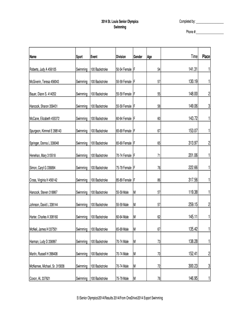 Completed by: 2014 St. Louis Senior Olympics Swimming Phone #: Time Place 54 141.31 1 5559 Female F 57 130.19 1 100 Backstroke 5559 Female F 55 148.00 2 Swimming 100 Backstroke 5559 Female F 58 149.06