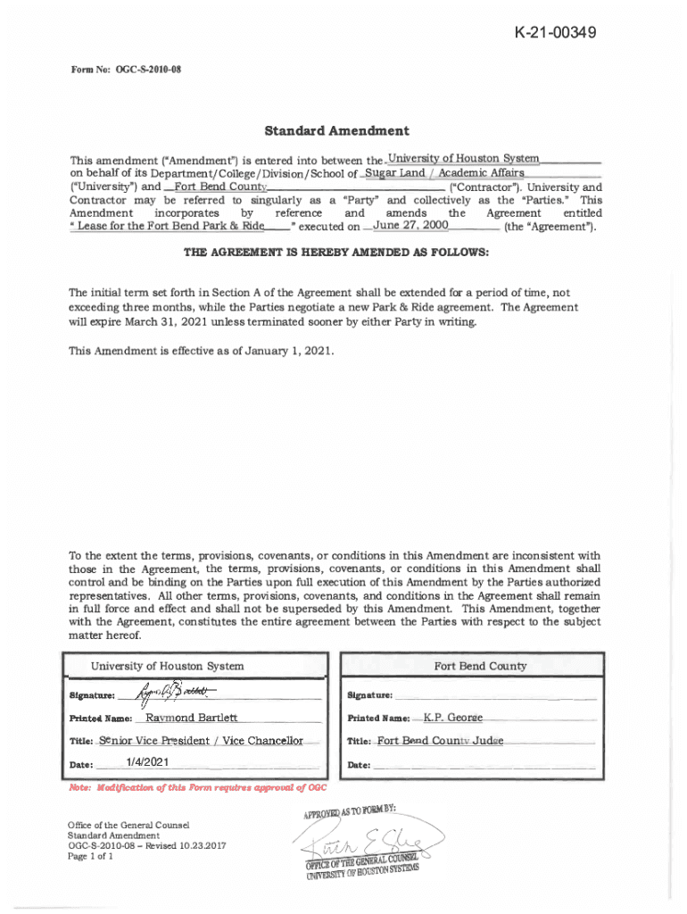 K2100349 Form No: OGCS201008Standard Amendment This amendment (\” Amendment\”) is entered into between the University of Houston System on behalf of its Department/College/Division/School of Sugar