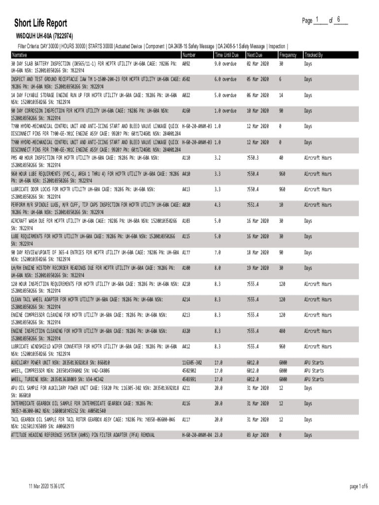 Short Life Report1 6 Page ___ of ___W6DQUH UH60A (7822974) Filter Criteria: DAY 30000 | HOURS 30000 | STARTS 30000 | Actuated Device | Component | DA 240815 Safety Message | DA 240851 Safety Message