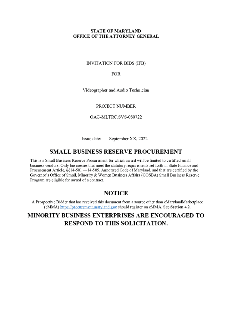 STATE OF MARYLAND OFFICE OF THE ATTORNEY GENERALINVITATION FOR BIDS (IF) FOR Videographer and Audio Technician PROJECT NUMBER MAGMATIC.SVS080722Issue date:September XX, 2022SMALL BUSINESS RESERVE