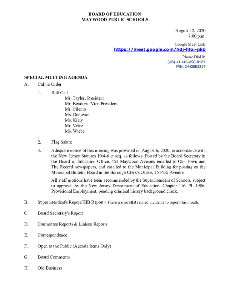 BOARD OF EDUCATION HAYWOOD PUBLIC SCHOOLS August 12, 2020 7:00 p.m. Google Meet Link https://meet.google.com/hdjhfoipkb Phone Dial In (US) +1 4133980137 PIN: 244280335#SPECIAL MEETING AGENDA A. Call