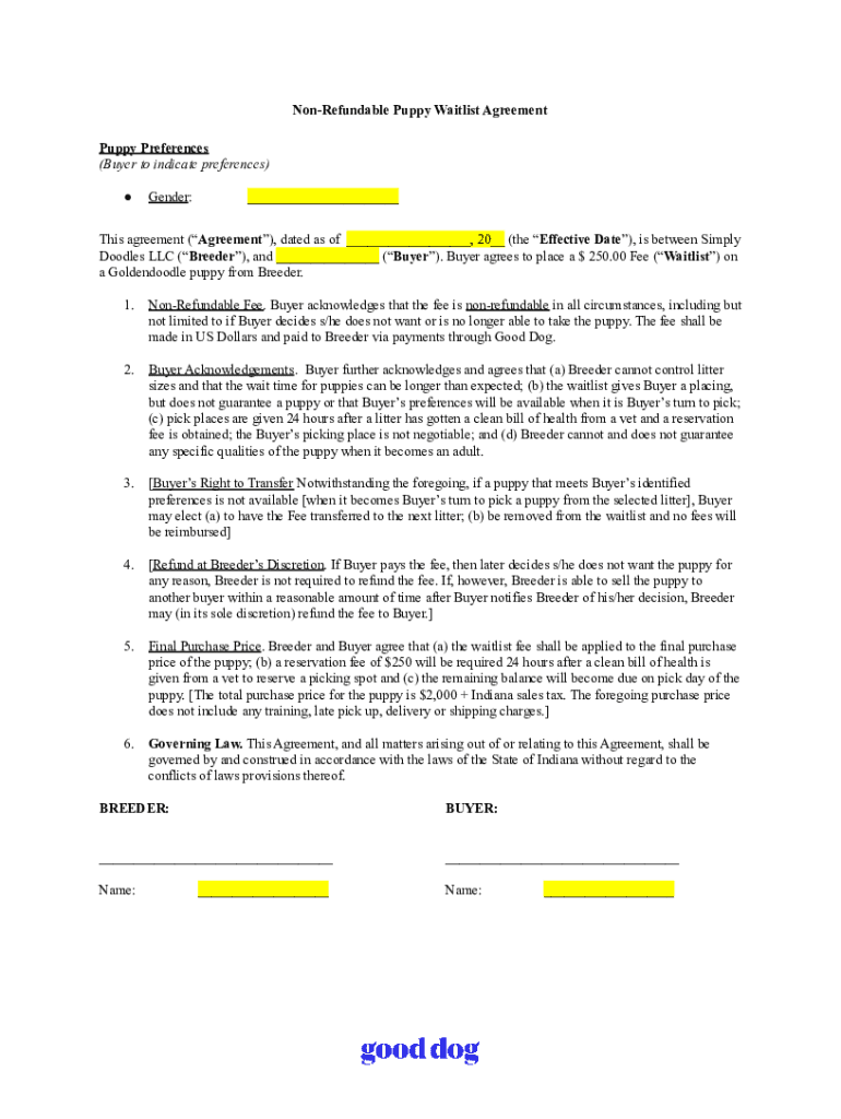 NonRefundable Puppy Waitlist Agreement Puppy Preferences (Buyer to indicate preferences) Gender:___This agreement (Agreement), dated as of ___, 20__ (the Effective Date), is between Simply Doodles