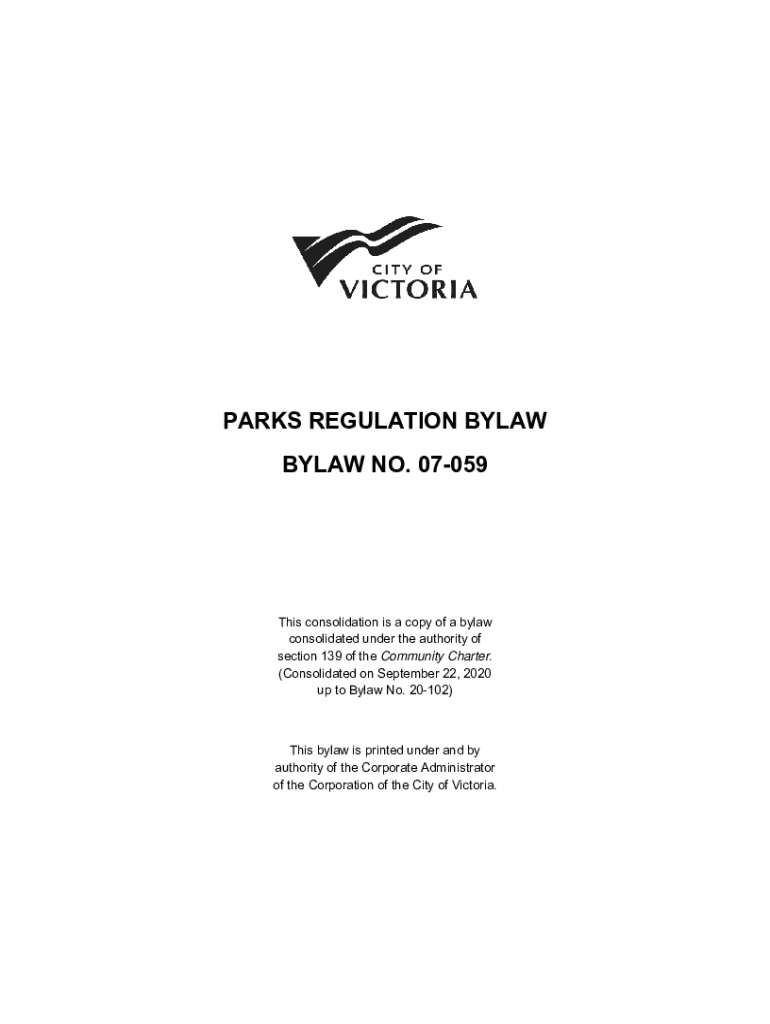 PARKS REGULATION BYLAW NO. 07059This consolidation is a copy of a bylaw consolidated under the authority of section 139 of the Community Charter. (Consolidated on September 22, 2020, up to Bylaw No.