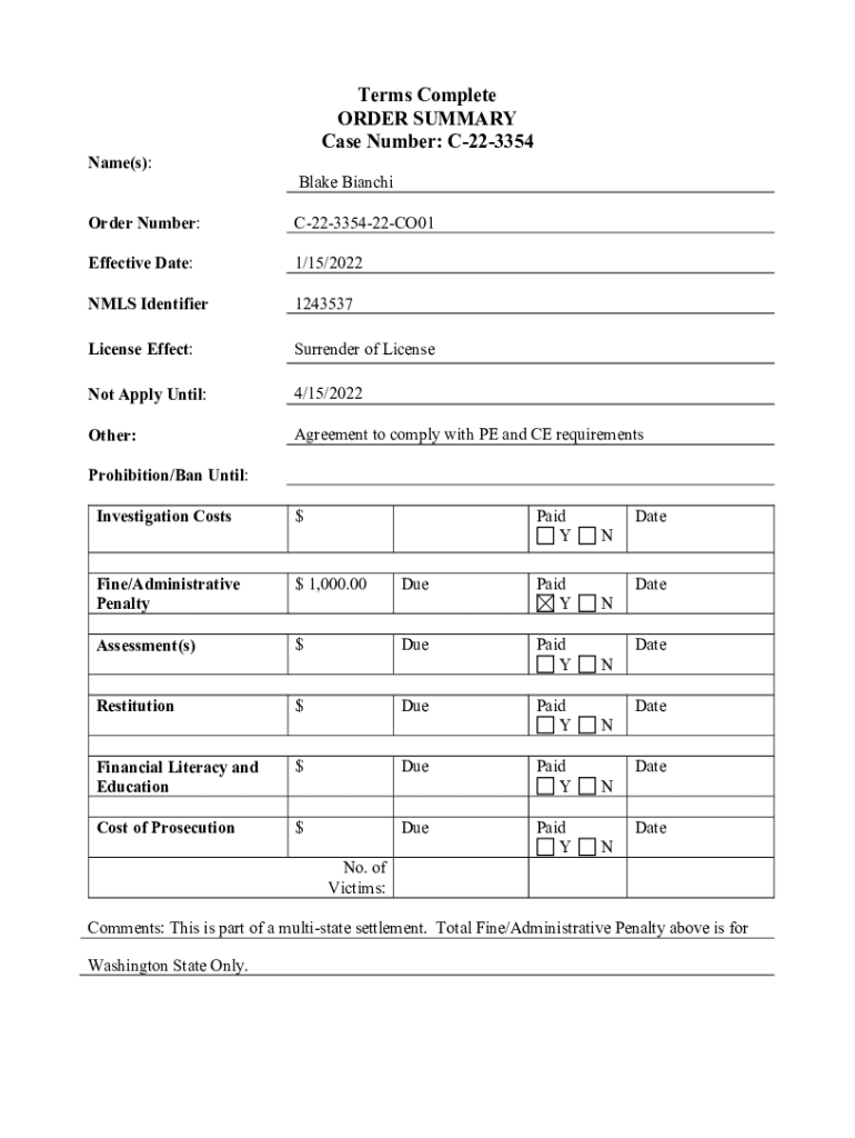 Name(s):Terms Complete ORDER SUMMARY Case Number: C223354 Blake BianchiOrder Number:C22335422CO01Effective Date:1/15/2022NMLS Identifier1243537License Effect:Surrender of License Apply Until:4/15/2022Other:Agreement