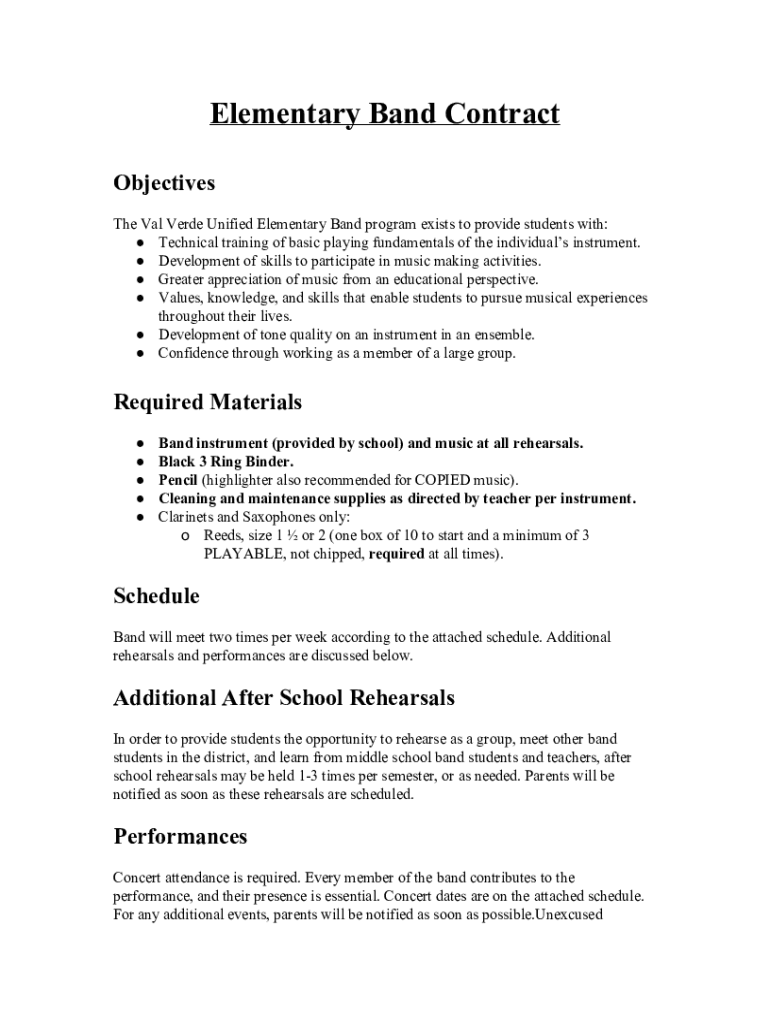 ElementaryBandContract Objectives TheValVerdeUnifiedElementaryBandprogramexiststoprovidestudentswith: Technicaltrainingofbasicplayingfundamentalsoftheindividualsinstrument. Developmentofskillstoparticipateinmusicmakingactivities.
