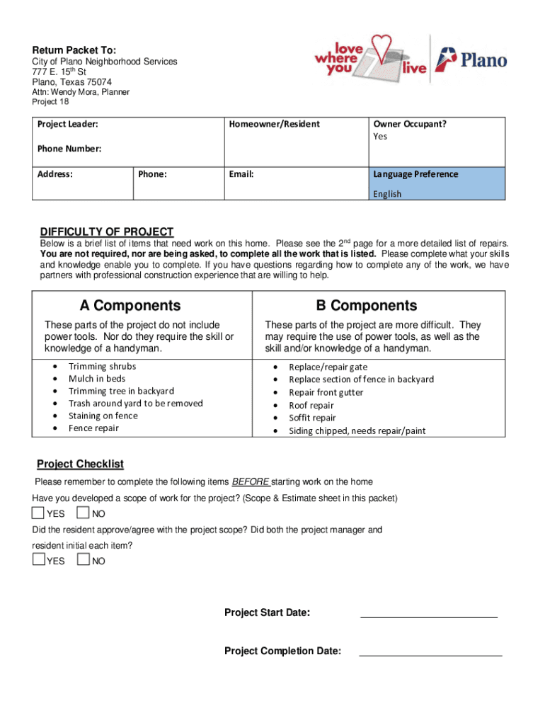 Return Packet To: City of Plano Neighborhood Services 777 E. 15th St Plano, Texas 75074 Attn: Wendy Morey, Planner Project 18Project Leader:Homeowner/ResidentOwner Occupant? Email:Language PreferencePhone