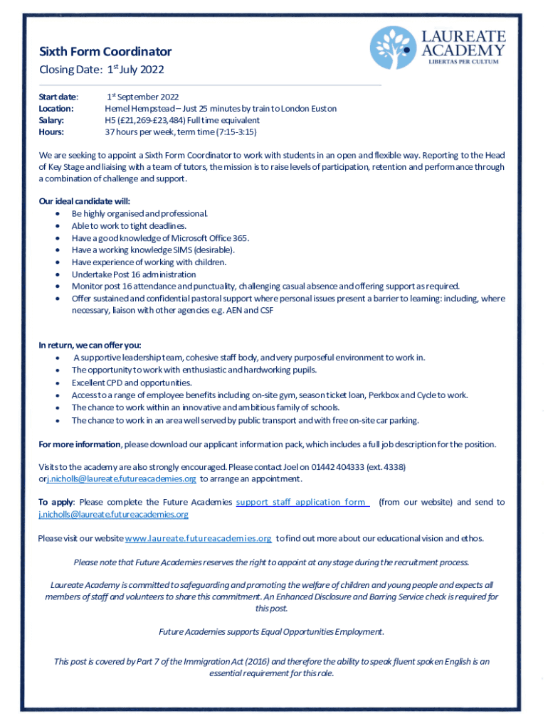 Sixth Form Coordinator Closing Date: 1st July 2022 Start date: Location: Salary: Hours:1st September 2022 Heel Hempstead Just 25 minutes by train to London Huston H5 (21,26923,484) Full time equivalent