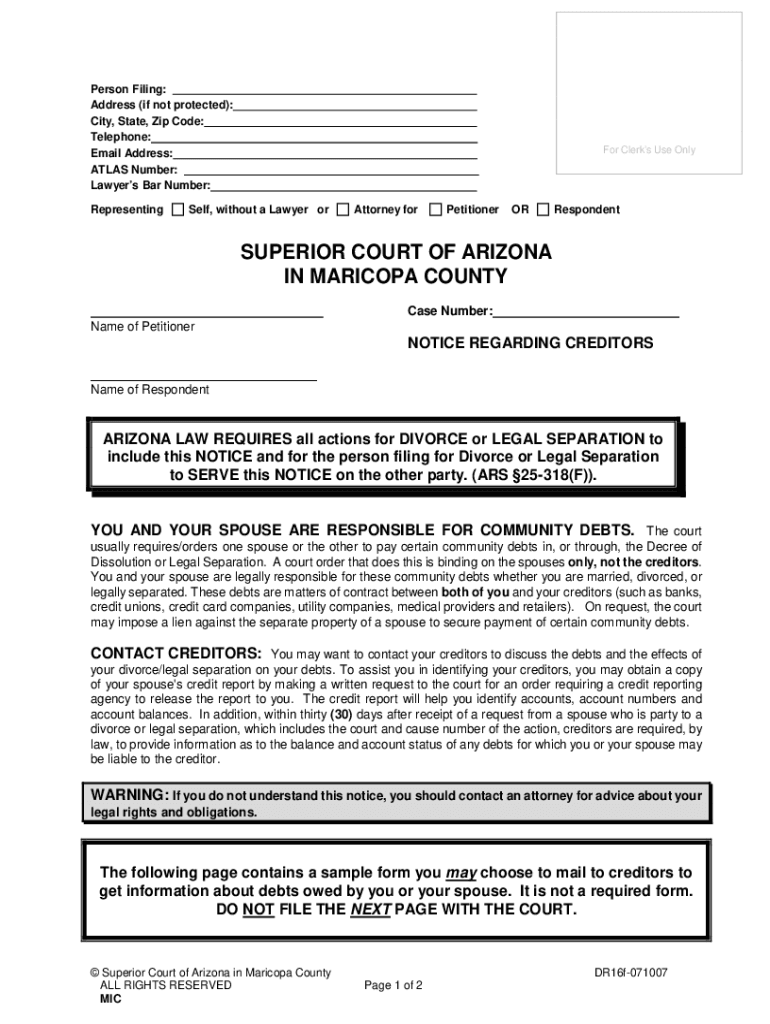 Person Filing: Address (if not protected): City, State, Zip Code: Telephone: Email Address: ATLAS Number: Lawyers Bar Number: Representing Clerks Use Oneself, without a Lawyer attorney forPetitionerORRespondentSUPERIOR