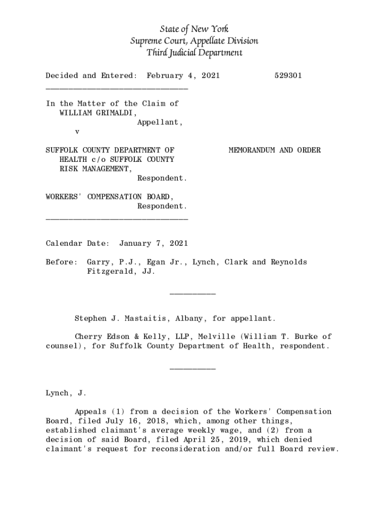 State of New York Supreme Court, Appellate Division Third Judicial Department Decided and Entered: February 4, 2021 ___529301In the Matter of the Claim of WILLIAM GRIMALDI, Appellant, v SUFFOLK COUNTY