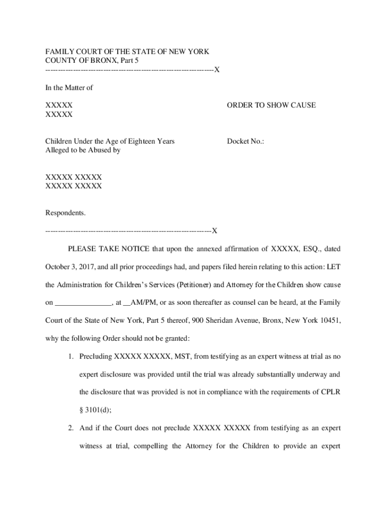 FAMILY COURT OF THE STATE OF NEW YORK COUNTY OF BRONX, Part 5 X In the Matter of XXXIX XXXXXORDER TO SHOW CAUSEChildren Under the Age of Eighteen Years Alleged to be Abused docket No.:XXXIX XXXIX