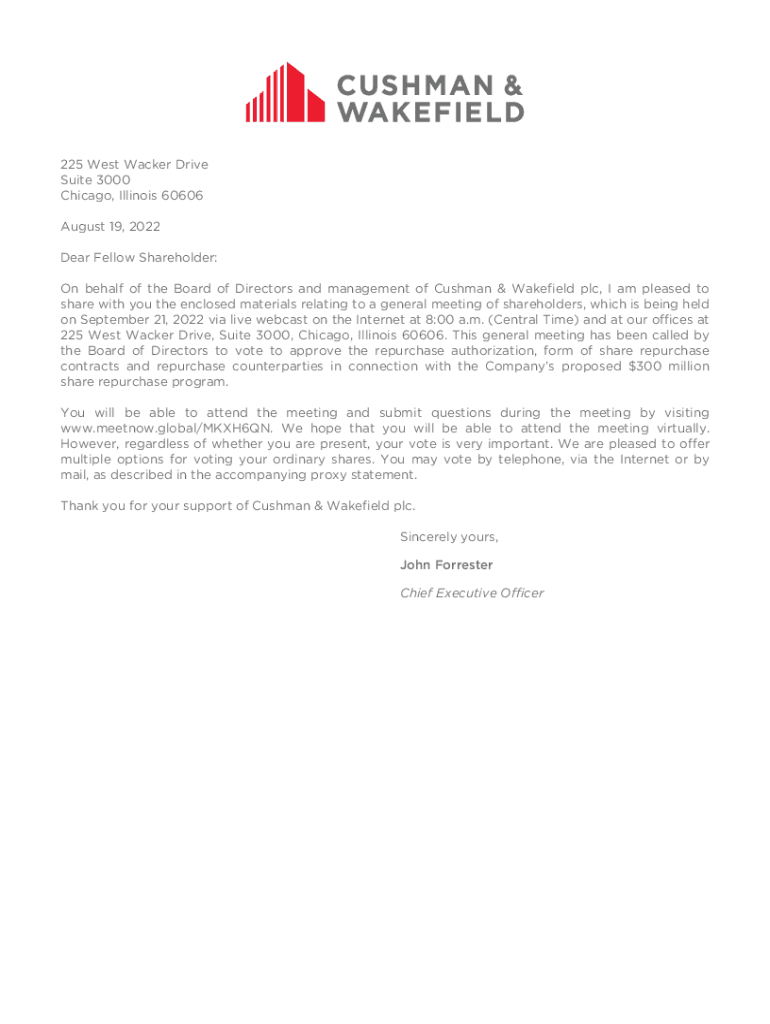 225 West Wacker Drive Suite 3000 Chicago, Illinois 60606 August 19, 2022, Dear Fellow Shareholder: On behalf of the Board of Directors and management of Cushman & Wakefield plc, I am pleased to share