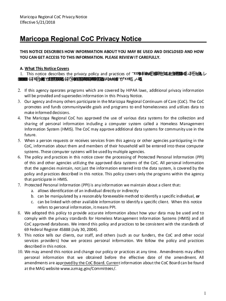 Maricopa Regional COC Privacy Notice Effective 5/21/2018Maricopa Regional COC Privacy Notice THIS NOTICE DESCRIBES HOW INFORMATION ABOUT YOU MAY BE USED AND DISCLOSED AND HOW YOU CAN GET ACCESS TO