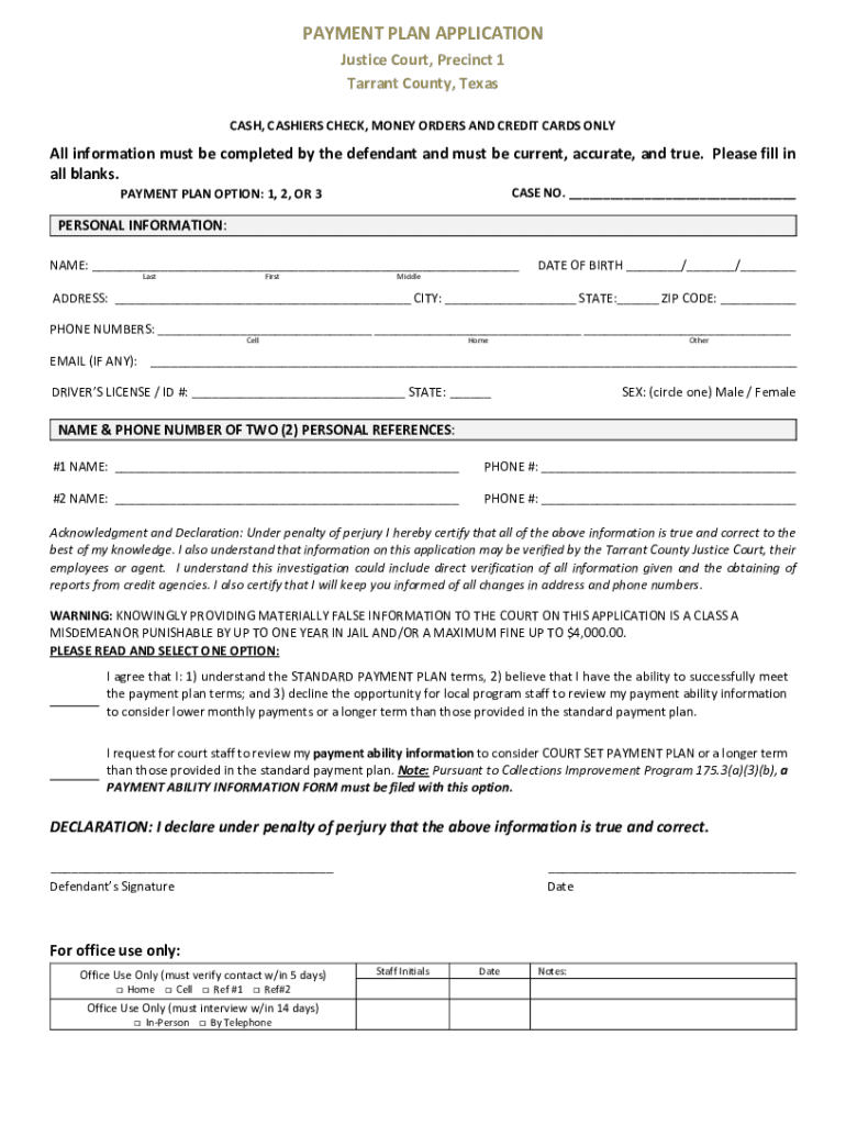 PAYMENT PLAN APPLICATION Justice Court, Precinct 1 Tarrant County, Texas CASH, CASHIERS CHECK, MONEY ORDERS AND CREDIT CARDS Only information must be completed by the defendant and must be current,