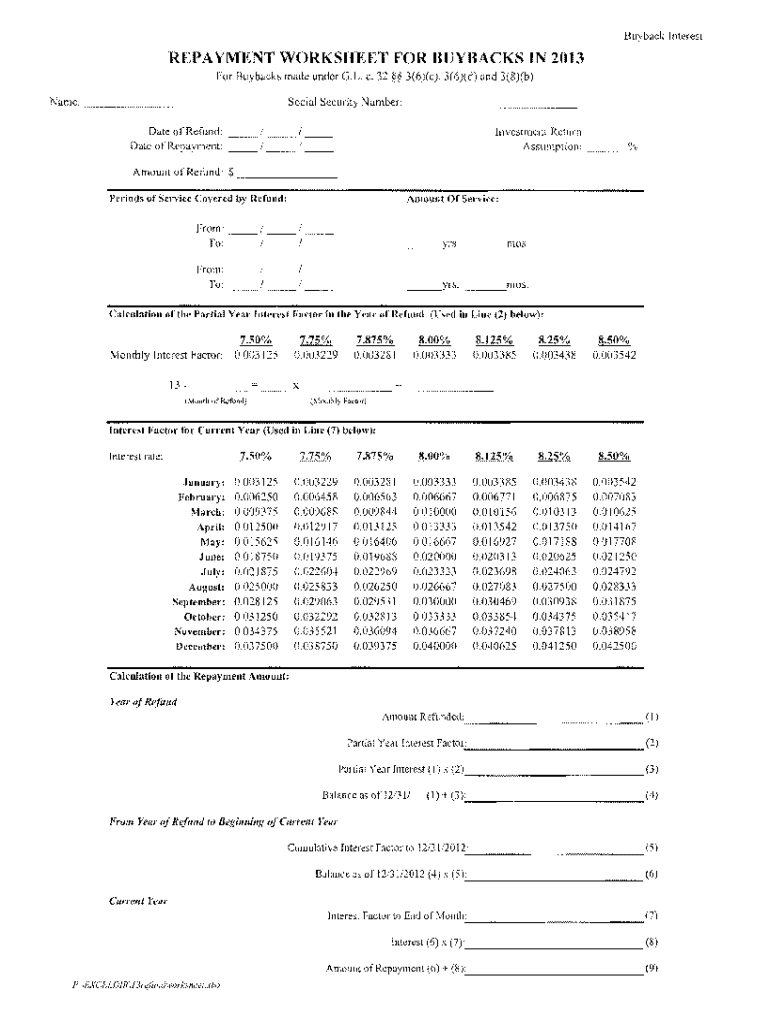Buyback InterestREPAYMENT WORKSHEET FOR BUYBACKS IN 2013 For Buyback:; made under G.L. c. 32 3(6)(c), 3(6)(d) and 3(8)(b) Name:. __.............._Social Security Number: _...... ..._ _ _ __Date of