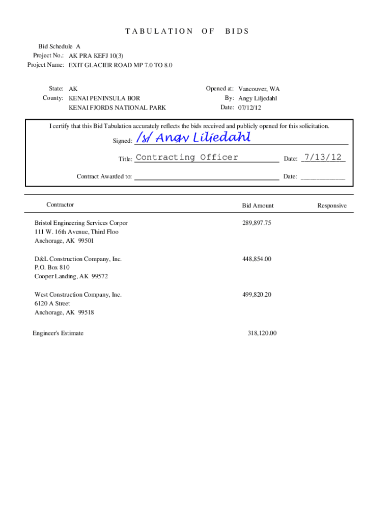 TABULATIONOFBIDSBid Schedule A Project No.: AK PRA KEF 10(3) Project Name: EXIT GLACIER ROAD MP 7.0 TO 8.0State: AK County: KEN AI PENINSULA FOR KENAI FJORDS NATIONAL Reopened at: Vancouver, WA By: