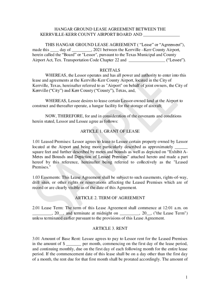 HANGAR GROUND LEASE AGREEMENT BETWEEN THE KERRVILLEKERR COUNTY AIRPORT BOARD AND ___ THIS HANGAR GROUND LEASE AGREEMENT (Lease or Agreement), made this ___ day of ___, 2021 between the Kerrville Kerr