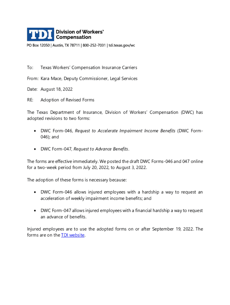 To:Texas Workers Compensation Insurance CarriersFrom: Kara Mace, Deputy Commissioner, Legal Services