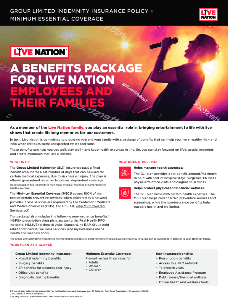 GROUP LIMITED INDEMNITY INSURANCE POLICY + MINIMUM ESSENTIAL COVERAGE BENEFITS PACKAGE FOR LIVE NATION EMPLOYEES AND THEIR FAMILIES As a member of the Live Nation family, you play an essential role