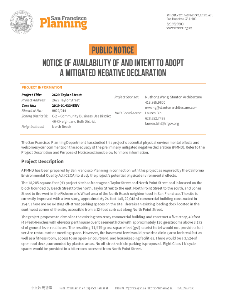 PUBLIC NOTICE OF AVAILABILITY OF AND INTENT TO ADOPT A MITIGATED NEGATIVE DECLARATION PROJECT INFORMATION Project Title: Project Address: Case No.: Block/Lot No.: Zoning District(s): Neighborhood:2629