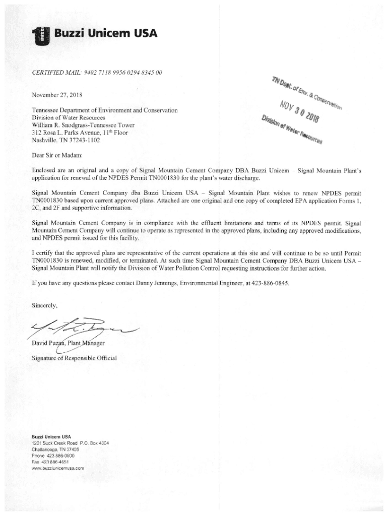 Buzz UNICEF UNCERTIFIED MAIL: 9402 7118 9956 0294 8345 00November 27,2018Tennessee Department of Environment and Conservation Division of Water Resources William R. SnodgrassTennessee Tower 312 Rosa