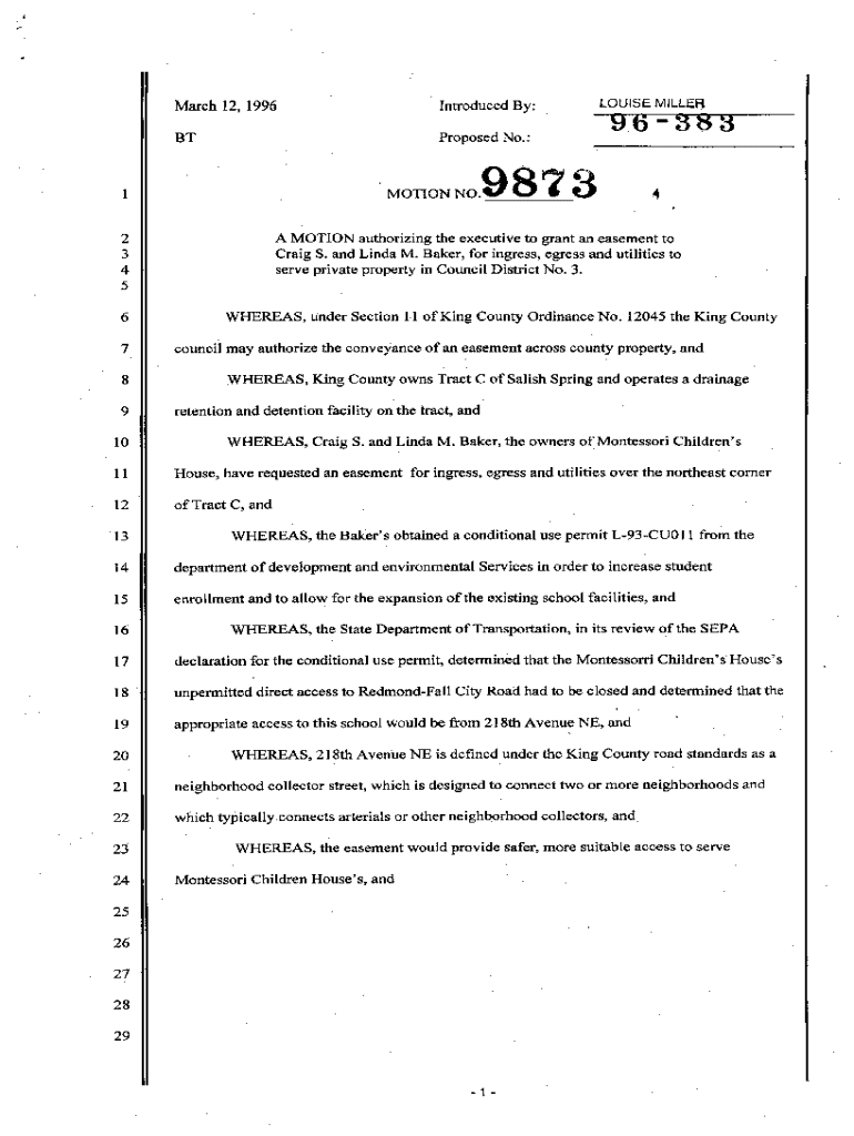 Q\'\” March 12, 1996Introduced By:Proposed No.:. MOTION No.912 3 4 5 6 II 7 II 8 II 9 II 10 LOUISE MILLEfJ9638387 3A MOTION authorizing the executive to grant an easement to Craig S. and Linda M.