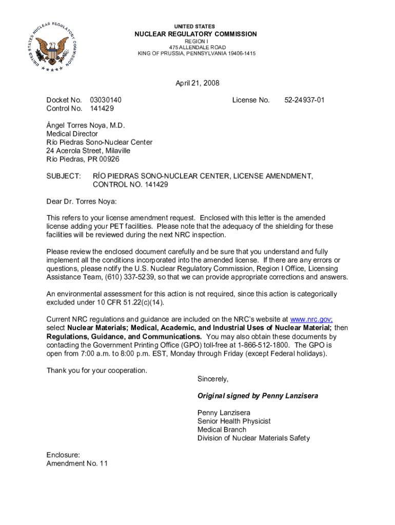 Get the free Rio Piedras Sono-Nuclear Center, License Amendment No. 11, Control No. 141429.