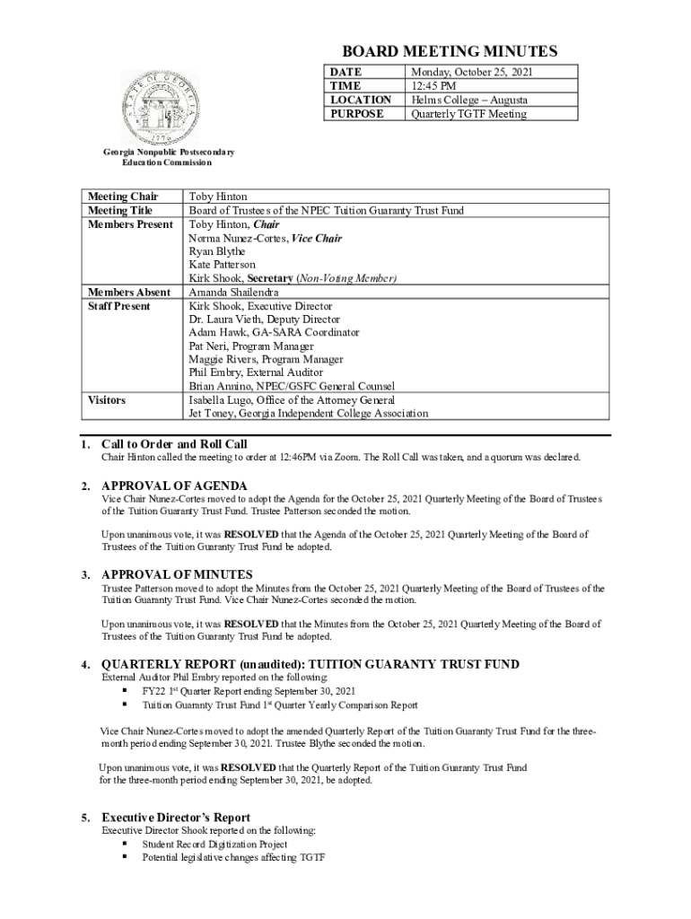 BOARD MEETING MINUTES DATE TIME LOCATION PURPOSE Monday, October 25, 2021 12:45 PM Helms College Augusta Quarterly TTF Meeting Georgia Nonpublic Postsecondary Education CommissionMeeting Chair Meeting