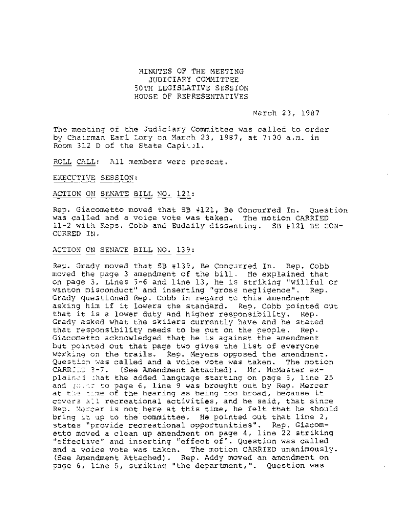MINUTES OF THE MEETING JUDICIARY COMMITTEE 50TH LEGISLATIVE SESSION HOUSE OF REPRESENTATIVES March 23, 1987, The meeting of the Judiciary Committee was called to order by Chairman Earl Lord on March