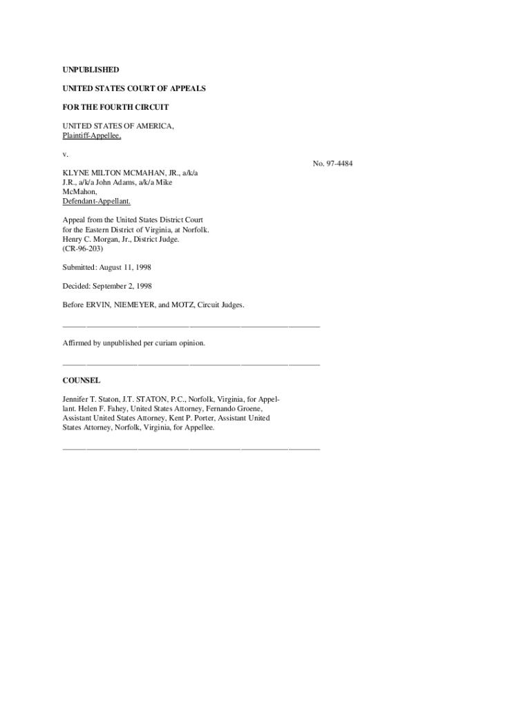 UNPUBLISHED UNITED STATES COURT OF APPEALS FOR THE FOURTH CIRCUIT UNITED STATES OF AMERICA, PlaintiffAppellee, v. No. 974484 KLINE MILTON McMahan, JR., a/k/a J.R., a/k/a John Adams, a/k/a Mike McMahon,