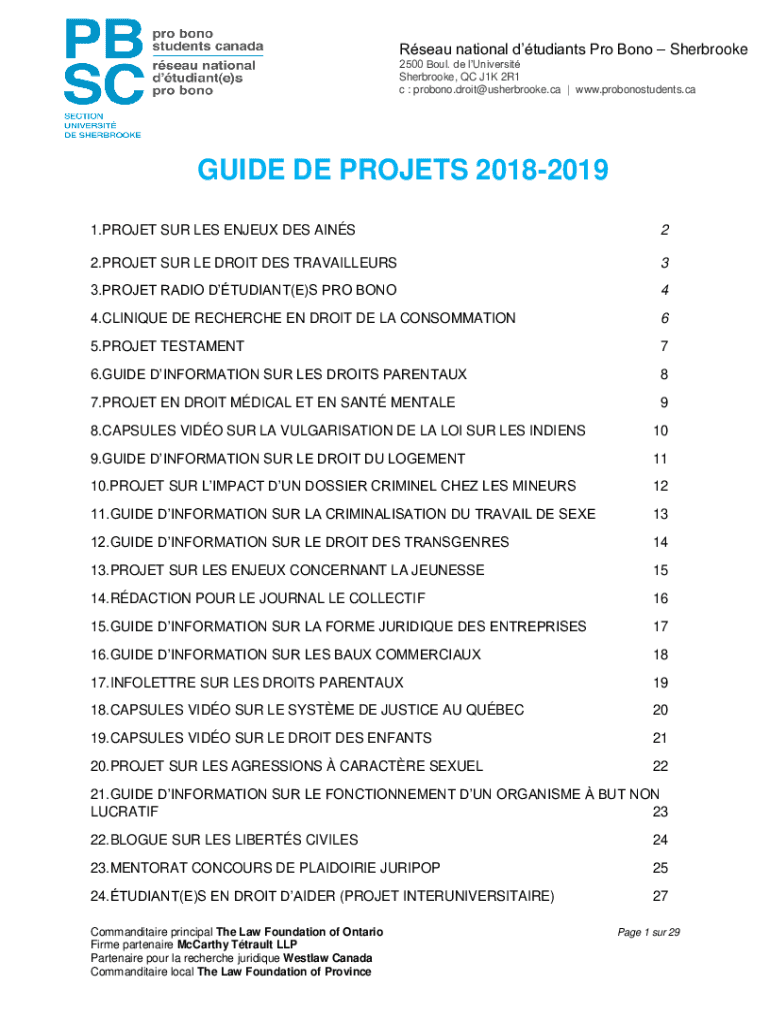 Roseau national students Pro Bono Sherbrooke 2500 Soul. DE's university Sherbrooke, QC J1K 2R1 c : probono.droit@usherbrooke.ca | www.probonostudents.caGUIDE DE PROJECTS 20182019 1.PROJECT SUR LES