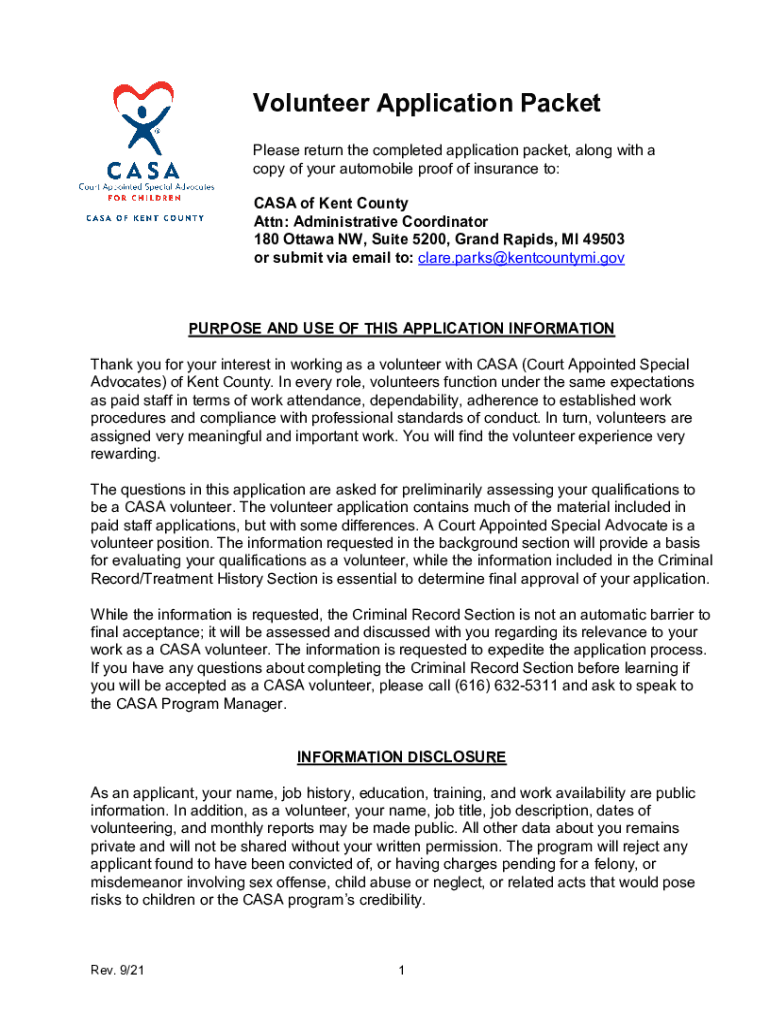 Volunteer Application Packet Please return the completed application packet, along with a copy of your automobile proof of insurance to: CASA of Kent County Attn: Administrative Coordinator 180 Ottawa