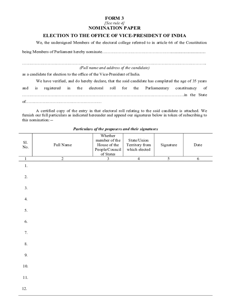 FORM 3 [See rule 4]NOMINATION PAPER ELECTION TO THE OFFICE OF VICEPRESIDENT OF INDIA We, the undersigned Members of the electoral college referred to in article 66 of the Constitution being Members