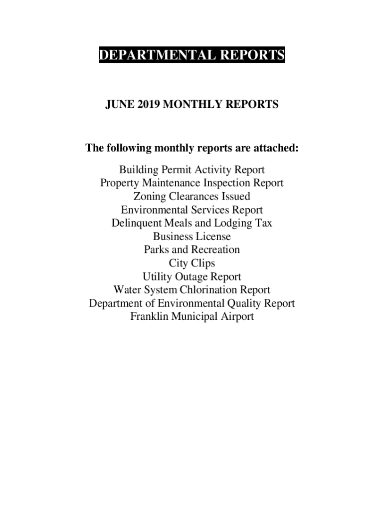 DEPARTMENTAL REPORTSJUNE 2019 MONTHLY Reports following monthly reports are attached: Building Permit Activity Report Property Maintenance Inspection Report Zoning Clearances Issued Environmental
