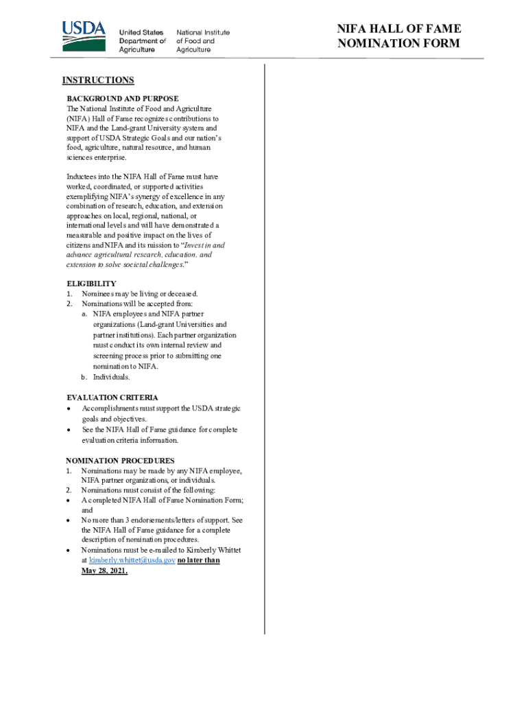 To fill out the NIFA Hall of Fame nomination form, you must provide information about the nominee's achievements, contributions, and impact on the field of agriculture.