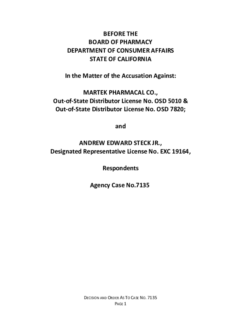 BEFORE THE BOARD OF PHARMACY DEPARTMENT OF CONSUMER AFFAIRS STATE OF CALIFORNIA In the Matter of the Accusation Against: MARTEL PHARMACY CO., OutofState Distributor License No. OSD 5010 & OutofState